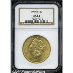 <table><tr><td><table><tr><td>1907-D $20 MS64 NGC. Well struck with full shimmering luster, bright orange-gold color, a couple of wispy lintmarks (as struck) on each side, and a very small number of strictly superficial surface blemishes, for a near-Gem. <BR><BR><B>Important notice:</B> Heritage usually auctions material at the rate of 200-250 lots per hour. On some occasions eBay Live bid software or the Internet may not be able to keep up with the pace of the auction. We recommend placing a realistic absentee bid now as insurance to avoid disappointment. Occasionally the auctioneer may eliminate or reject an eBay Live bid, and the auctioneer may also reopen a lot after the close of the eBay live bidding (usually because we missed an audience bid), and may reject your bid even if it shows you as the winning bidder. By bidding via eBay Live, you agree that Heritage may award the lot to another bidder at its sole discretion under the circumstances described above or any other reasonable circumstances. Since eBay bids are not shown to us until we open the lot on the floor, we treat those bids just like floor bids. In most cases the floor responds before the eBay bid is presented to us, due to Internet lag time, so for consistency we have made it a policy that floor bids are always considered first over tie eBay live bids. Also please note that all Heritage lots purchased through eBay Live carry a 20% Buyer's Premium. Please make sure you read the Terms and Conditions before you bid. <BR><BR><B>IMPORTANT ANNOUNCEMENT ABOUT RESERVES:</B> Heritage now divulges all reserves on its web site 7 days before every auction. If you want to know whether the reserve on this lot has been met, and if not, what the reserve amount is, please visit this lot page on the HeritageCoin.com web site, or email: bid@HeritageGalleries.com </span></font></td></tr></table></td></tr></table>