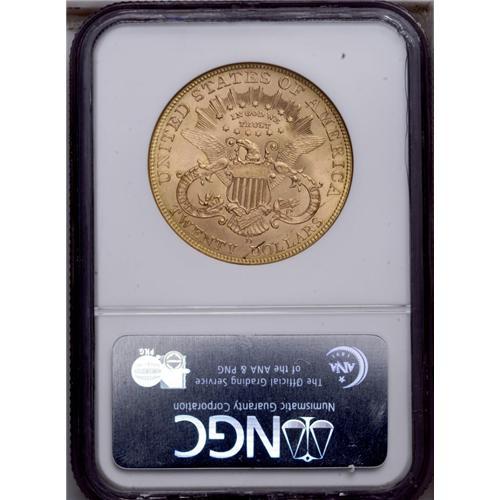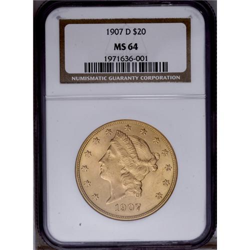 <B>1907-D<$20> MS64 NGC.</B></I> While some 1907-D double eagles have been found in Europe, the majority of these coins appeared to have stayed in the U.S. Lower grade specimens through MS64 are available, but full Gems become more challenging. This MS64 example displays smooth honey-gold surfaces with whispers of light tan color, and glowing luster. The design features are well impressed throughout. A handful of minute marks on Liberty's cheek and neck limit the grade. A thin grease streak crosses the D in DOLLARS.