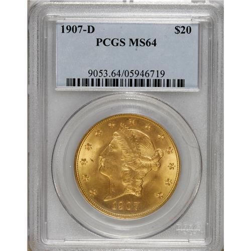 <B>1907-D $20 MS64 PCGS.</B></I> Of the two Liberty double eagle issues minted at Denver, the 1907-D is slightly more available. This butter-yellow representative has silky surfaces and a single grade-defining abrasion on Liberty's cheek.<BR><BR><b>Shipping:</b> Coins & Currency (<a target="_blank" href="http://www.heritageauctions.com/common/shipping.php">view shipping information</a>)