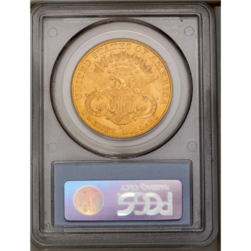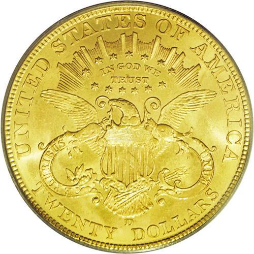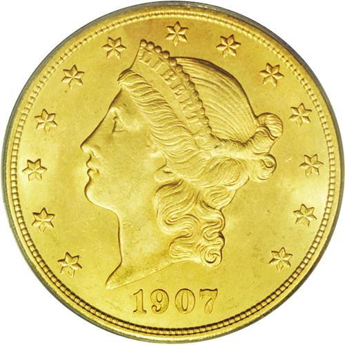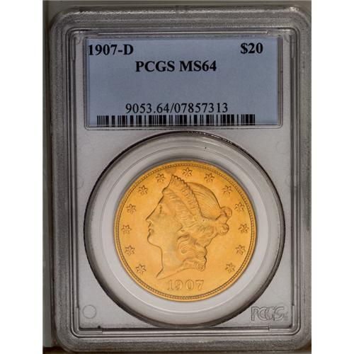 <B>1907-D<$20> MS64 PCGS.</B></I> Slightly subdued green-gold toning attractively covers the surfaces of this coin. A few tiny abrasions and luster breaks dance across the surfaces, however, these are all very small and undistracting. For the grade, an exceptionally appealing coin.