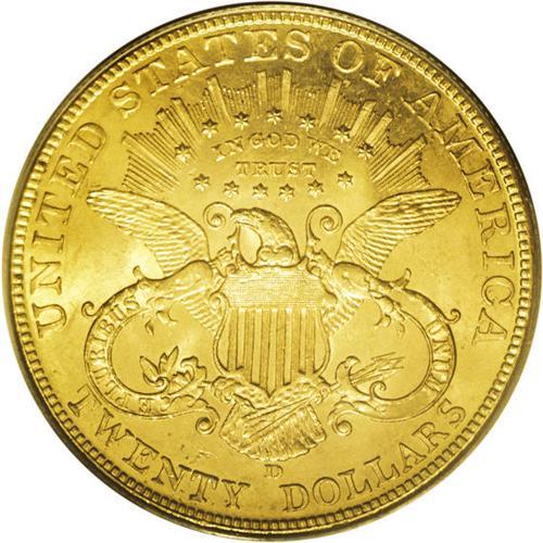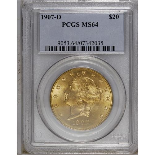 <B>1907-D<$20> MS64 PCGS.</B></I> The second and final Denver Mint Liberty Twenty is collectible at the MS64 level, but few such pieces can compare with the originality of this lustrous khaki-gold near-Gem. Freckles of russet patina near the borders are left undisturbed, and both sides are clean aside from a faint scuff near the forehead and an unobtrusive hair-thin mark beneath the IT in UNITED.
