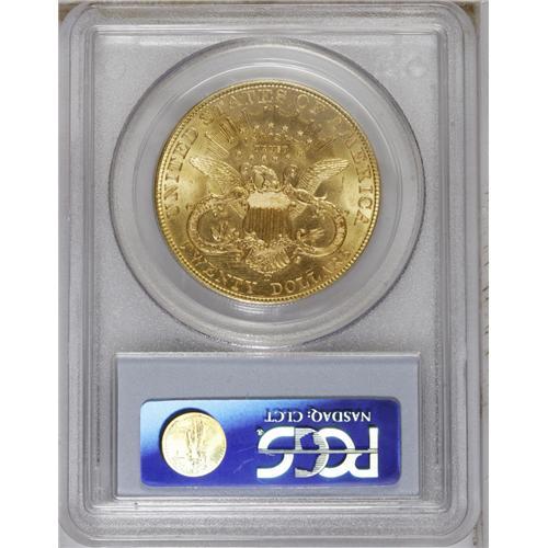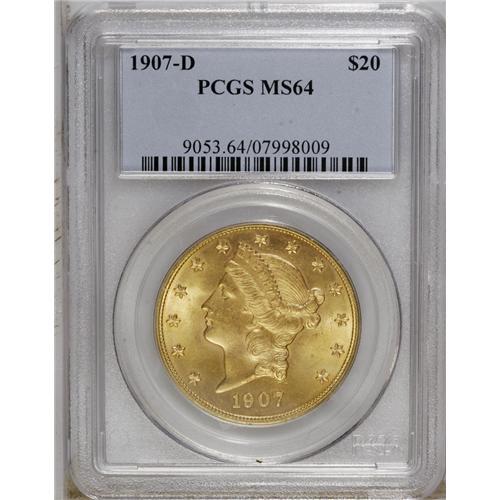 <B>1907-D<$20> MS64 PCGS.</B></I> This second-year Denver Mint issue is sometime seen with highly prooflike surfaces. The present piece does show some prooflikeness on the reverse, but not so on the obverse. The strike is bold, and brilliant cartwheel luster radiates from the pretty orange-yellow surfaces. A nice coin for the grade.
