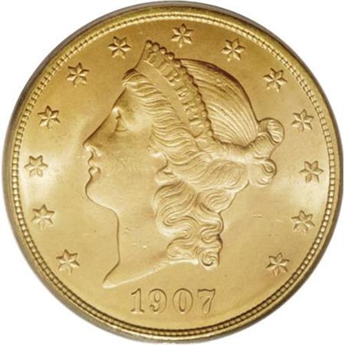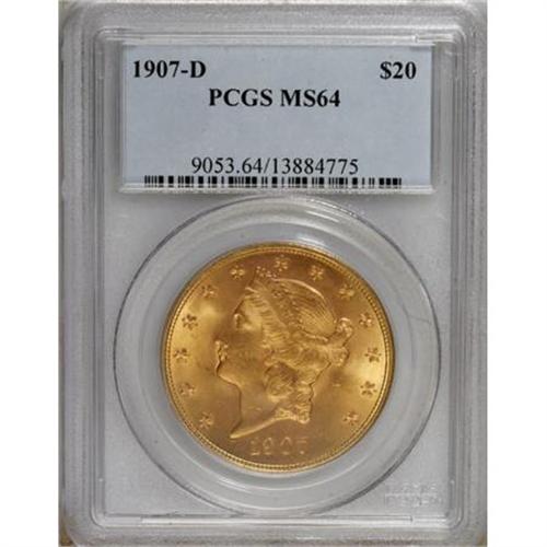 <B>1907-D $20 MS64 PCGS.</B></I> Orange-gold surface display strong luster, and just a few minor grade-defining marks. All of the design elements are well brought up by the dies. The second and final Denver Mint Liberty double eagle, which becomes scarce in attractive Mint State grades.<BR><BR><b>Shipping:</b> Coins & Currency (<a target="_blank" href="http://www.heritageauctions.com/common/shipping.php">view shipping information</a>)