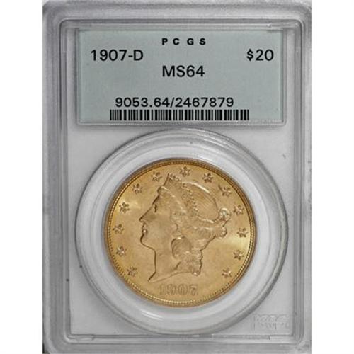 <B>1907-D $20 MS64 PCGS.</B></I> Dazzling luster and an intricate strike provide attractive eye appeal. This piece appears conservatively graded at first glance, although close evaluation locates concealed marks above the ear and beneath the jaw. The obverse die is lapped, causing prooflike areas near the ear similar to that seen on several proof Barber dates. Encapsulated in a green label holder.<BR><BR><b>Shipping:</b> Coins & Currency (<a target="_blank" href="http://www.heritageauctions.com/common/shipping.php">view shipping information</a>)