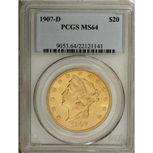 <B>1907-D $20 MS64 PCGS.</B></I> This is the last year of the Liberty Head type. Radiantly lustrous surfaces adorn this near-Gem, and pretty apricot-gold color has traces of light green. A solid strike emboldens the design elements, and a few unobtrusive marks just barely preclude full Gem classification.<BR><I>From The New York Eye Appeal Collection, Part Three.</B></I><BR><BR><B>Coin Engraver:</B> James B. Longacre<BR><BR><b>Shipping:</b> Coins & Currency (<a target="_blank" href="http://www.heritageauctions.com/common/shipping.php">view shipping information</a>)