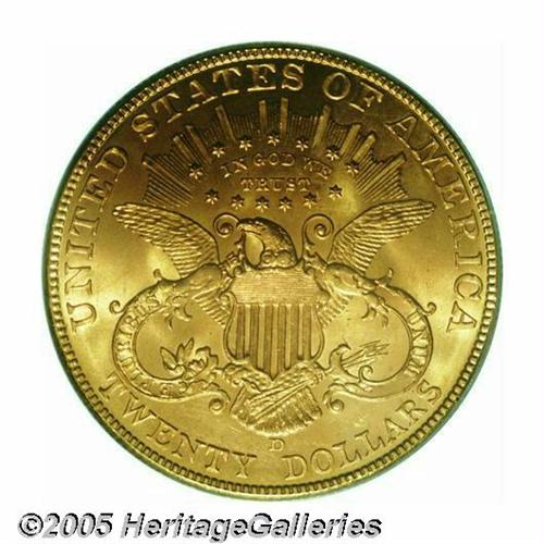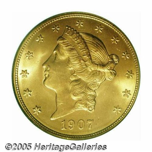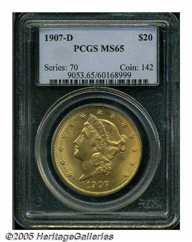 <B>1907-D<$20> MS65 PCGS.</B></I> Brilliant and satiny. A splendid example and one certain to delight virtually any numismatist. Most design features are sharp, and only a few trivial contact marks can be seen. Liberty Head double eagles were struck at the Denver Mint only in the years 1906 and 1907, and accordingly gem-quality survivors are eagerly sought be specialists, especially when they're as beautifully preserved as the specimen offered here.