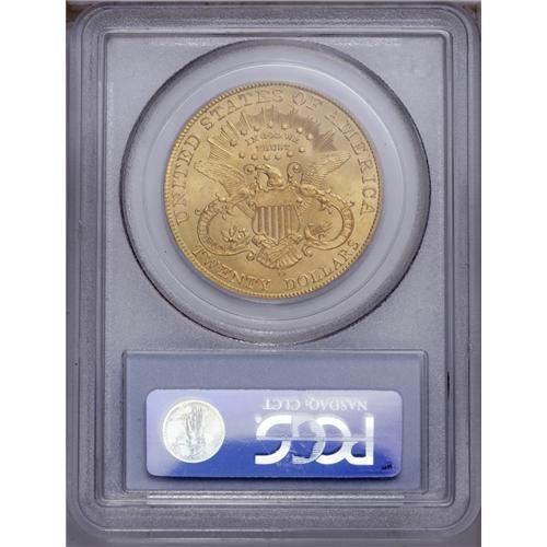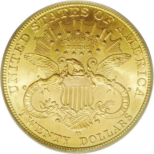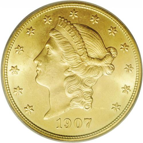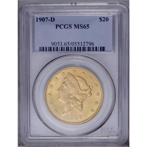 <B>1907-D<$20> MS65 PCGS.</B></I> This amazingly clean Gem displays a full strike and frosty, radiantly lustrous surfaces on obverse and reverse alike. The subtle color variations include peach, reddish-gold, and pastel-green. While the reverse seems pristine, the obverse has a few very superficial marks at the lower portion. One of only two Denver Mint Liberty double eagles and always a popular issue.