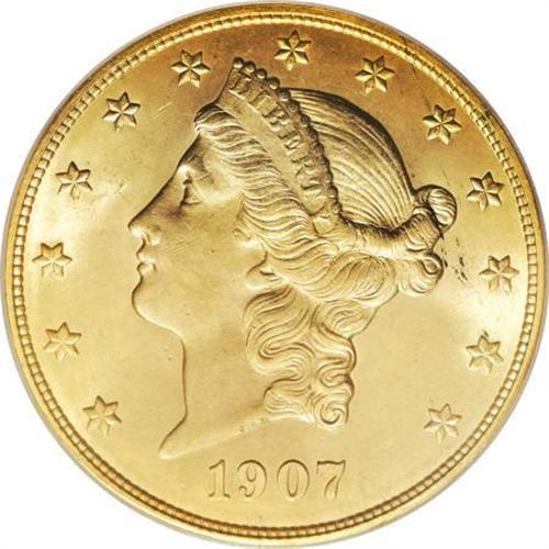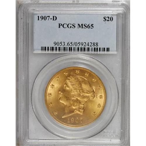 <B>1907-D $20 MS65 PCGS.</B></I> An amazing Gem with vibrant orange-gold luster and pristine, satiny surfaces. Generally sharp in all details, with only the eagle's head showing any strike deficiency. This is the final year of issue for the design, and one of just two Denver Mint double eagles from the Liberty Head dies. PCGS has only graded 14 finer examples of the date.<BR><BR><B>Coin Engraver:</B> James B. Longacre<BR><BR><b>Shipping:</b> Coins & Currency (<a target="_blank" href="http://www.heritageauctions.com/common/shipping.php">view shipping information</a>)