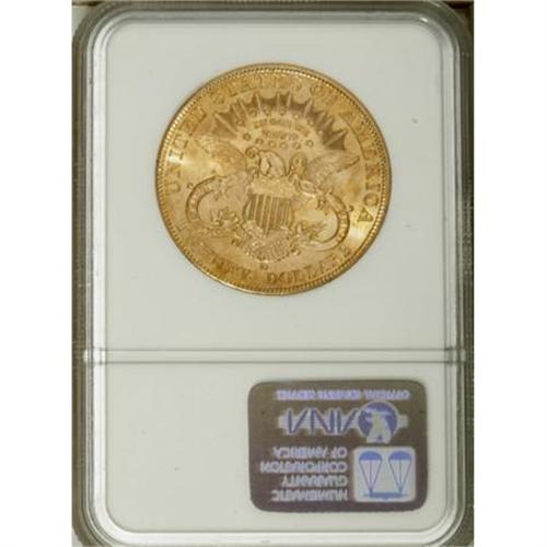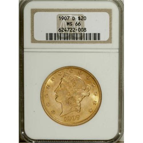 <B>1907-D $20 MS66 NGC.</B></I> The rose-gold coloration is enhanced by speckled accents of sunset-orange, and intense mint luster flashes from the bright surfaces. Generally well struck, except for slight flatness on the side of the eagle's head, this lovely Premium Gem is also impressively preserved, showing just a handful of trivial nicks on the lower obverse and a nearly blemish-free reverse. This issue is very popular with collectors, as it was the final Liberty Head double eagle delivery from the Denver Mint. Garrett and Guth (2006) note that a surprising number of Gems are known of this date. Premium Gems such as the present example are scarcer, however, and are infrequently seen at public auction. Census: 27 in 66, 3 finer (6/07). <BR><BR><B>Coin Engraver:</B> James B. Longacre<BR><BR><b>Shipping:</b> Coins & Currency (<a target="_blank" href="http://www.heritageauctions.com/common/shipping.php">view shipping information</a>\)
