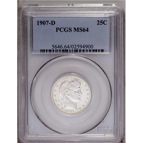 <B>1907-D<25C> MS64 PCGS.</B></I> This semi-prooflike near-Gem is essentially untoned on either side. The surfaces are bright, nonetheless, with no singularly mentionable abrasions. This is a sharply impressed representative of a conditionally challenging issue that is seldom offered in grades above the MS64 level.