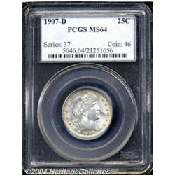 <B>1907-D<25C> MS64 PCGS.</B></I> Mostly silver-gray patina covers the bright surfaces, save for a band of rose-tan color near the peripheries of each side. A few marks can be discerned upon close examination, but this coin has the immediate eye appeal of a true Gem. Well struck. Population: 23 in 64, 10 finer (3/04).<BR><I>From the JFS Collection.</B></I> <BR><BR><B>Important notice:</B> Heritage usually auctions material at the rate of 200-250 lots per hour. On some occasions eBay Live bid software or the Internet may not be able to keep up with the pace of the auction. We recommend placing a realistic absentee bid now as insurance to avoid disappointment. Occasionally the auctioneer may eliminate or reject an eBay Live bid, and the auctioneer may also reopen a lot after the close of the eBay live bidding (usually because we missed an audience bid), and may reject your bid even if it shows you as the winning bidder. By bidding via eBay Live, you agree that Heritage may award the lot to another bidder at its sole discretion under the circumstances described above or any other reasonable circumstances. Since eBay bids are not shown to us until we open the lot on the floor, we treat those bids just like floor bids. In most cases the floor responds before the eBay bid is presented to us, due to Internet lag time, so for consistency we have made it a policy that floor bids are always considered first over tie eBay live bids. Also please note that all Heritage lots purchased through eBay Live carry a 20% Buyer's Premium. Please make sure you read the Terms and Conditions before you bid. </span></font></tr></table></td></tr></table>