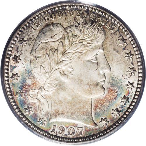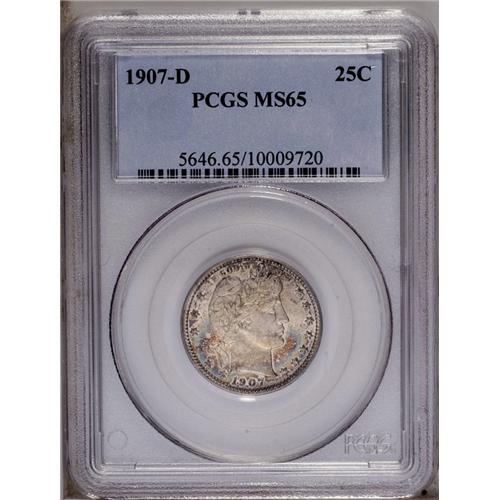 <B>1907-D<25C> MS65 PCGS.</B></I> Circulated and lower Mint State 1907-D quarters are readily available, but higher Uncirculated coins are more elusive. Fewer than 20 Gems have been certified by PCGS and NGC combined, and a mere five coins are graded finer. This issue is often weakly struck, but the present MS65 example displays relatively good definition. Only a couple of the obverse star centers, and the eagle's left (right facing) claw and adjacent arrow feathers are weak. Occasional splashes of lavender, cobalt-blue, and golden-tan patina visit radiantly lustrous surfaces that are well preserved. Population: 10 in 65, 3 finer (3/06).