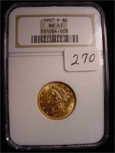 1907-D $5.00 Liberty Gold Coin NGC MS 63