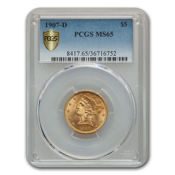 One piece 1907-D $5 Liberty Gold Half Eagle MS-65 PCGS