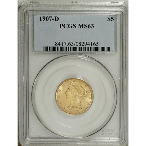 <B>1907-D $5 MS63 PCGS.</B></I> A highly lustrous and minimally marked example of this second Denver Mint half eagle issue. Well struck overall, though touch of softness is noted on the central devices.<BR><BR><b>Shipping:</b> Coin/Currency (<a target="_blank" href="http://www.heritageauctions.com/common/shipping.php">view shipping information</a>)