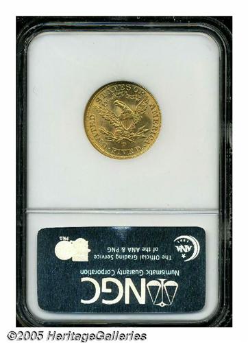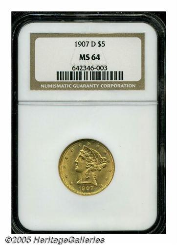 <B>1907-D<$5> MS64 NGC.</B></I> A crisply struck and carefully preserved near-Gem. A honey-gold representative of the second and final Denver Mint issue of the type. An interesting mint-made lintmark is noted on Liberty's jaw.