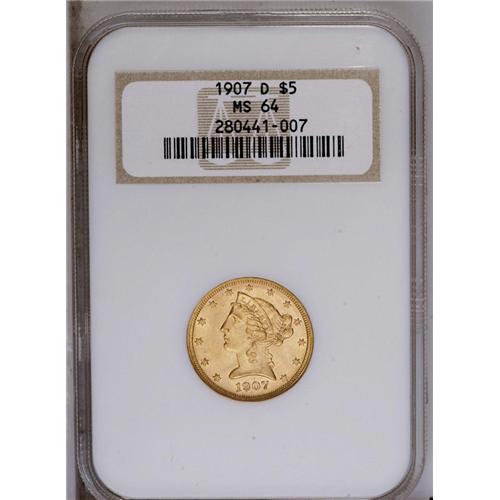<B>1907-D<$5> MS64 NGC.</B></I> A lovely final year Liberty half eagle with clean fields and exemplary devices. Encased in an early generation holder.