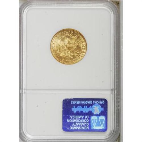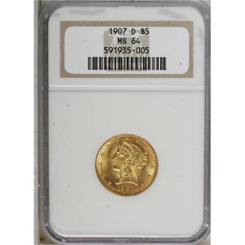 <B>1907-D $5 MS64 NGC.</B></I> The Denver Mint opened a year earlier, and only struck Liberty Head gold pieces in 1906 and 1907. This piece represents half of the set! Satiny yellow-gold luster accompanies sharp design motifs.<BR><BR><B>Coin Engraver:</B> Christian Gobrecht<BR><BR><b>Shipping:</b> Coins & Currency (<a target="_blank" href="http://www.heritageauctions.com/common/shipping.php">view shipping information</a>)
