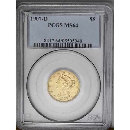 <B>1907-D<$5> MS64 PCGS.</B></I> A lustrous and precisely struck tan-gold near-Gem. The reverse is gorgeously preserved, and the portrait is also uncommonly smooth. Even the often abraded obverse field is clean.