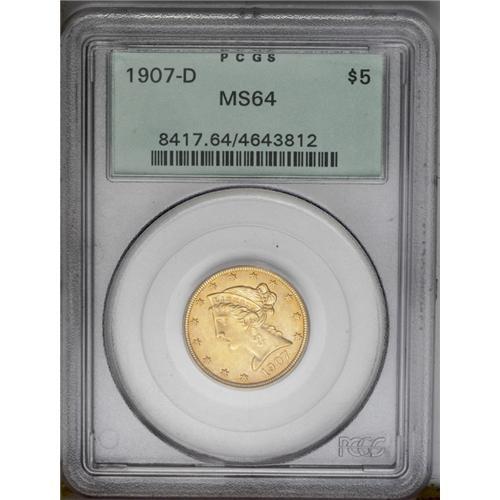 <B>1907-D<$5> MS64 PCGS.</B></I> Beautifully smooth orange-gold surfaces ensure the eye appeal of this nicely struck half eagle. A couple of nearly invisible vertical slide marks on the portrait decide the grade. The second and final Denver issue of the type. Housed in a green label PCGS holder.