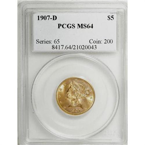 <B>1907-D $5 MS64 PCGS.</B></I> PCGS Population (418/96). NGC Census: (363/112). Mintage: 888,000. Numismedia Wsl. Price for NGC/PCGS coin in MS64: $1,400. (#8417)<BR><BR><B>Coin Engraver:</B> Christian Gobrecht<BR><BR><b>Shipping:</b> Coins & Currency (<a target="_blank" href="http://www.heritageauctions.com/common/shipping.php">view shipping information</a>)