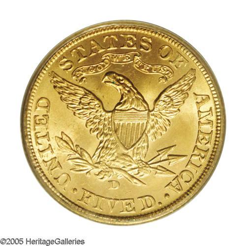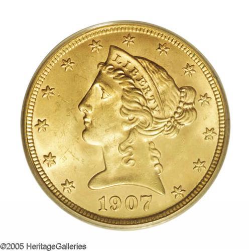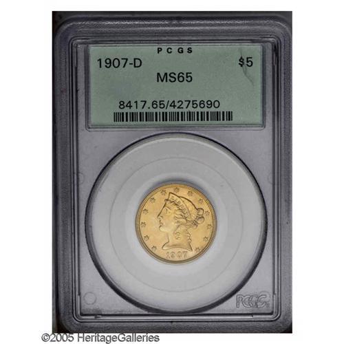 <B>1907-D<$5> MS65 PCGS.</B></I> A bold striking with satiny radiance beneath tinges of orange-gold patina. Only a few scattered field marks keep this second-year Denver issue from an even loftier Mint State rating.