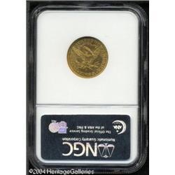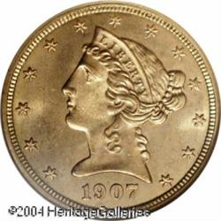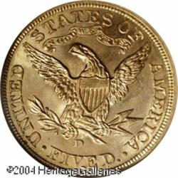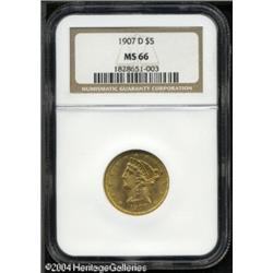 1907-D $5 MS66 NGC. One of only two Coronet Half E <B>1907-D $5 MS66 NGC.</B></I> One of only two Coronet Half Eagle issues produced by the Denver Mint, the '07-D is a popular date among type collectors. Rich yellow-gold and rose-gold color swirls compete for dominance on both sides of this boldly defined representative. Free of most distracting luster grazes, alloy spots, and abrasions, this is an unqualified Gem. Population: 23 in 66, 2 finer (11/04). <BR><BR><B>Important notice:</B> Heritage usually auctions material at the rate of 200-250 lots per hour. On some occasions eBay Live bid software or the Internet may not be able to keep up with the pace of the auction. We recommend placing a realistic absentee bid now as insurance to avoid disappointment. Occasionally the auctioneer may eliminate or reject an eBay Live bid, and the auctioneer may also reopen a lot after the close of the eBay live bidding (usually because we missed an audience bid), and may reject your bid even if it shows you as the winning bidder. By bidding via eBay Live, you agree that Heritage may award the lot to another bidder at its sole discretion under the circumstances described above or any other reasonable circumstances. Since eBay bids are not shown to us until we open the lot on the floor, we treat those bids just like floor bids. In most cases the floor responds before the eBay bid is presented to us, due to Internet lag time, so for consistency we have made it a policy that floor bids are always considered first over tie eBay live bids. Also please note that all Heritage lots purchased through eBay Live carry a 20% Buyer's Premium. Please make sure you read the Terms and Conditions before you bid. This lot is being auctioned in conjunction with a live floor auction by Heritage Galleries & Auctioneers. All final auction and invoice information will be supplied by Heritage Galleries & Auctioneers, and all other information should be considered preliminary. Lot:6691