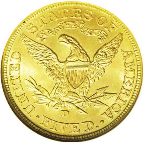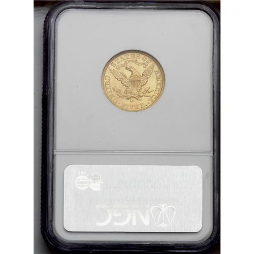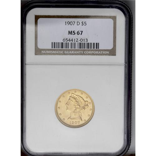 <B>1907-D<$5> MS67 NGC.</B></I> Tilted Mintmark. This variety has the mintmark tilted or canted sharply to the left with the upright of the mintmark nearly parallel to the left diagonal of the V in FIVE. The NGC Census Report states that just three examples of this date have been certified at the Superb Gem MS67 grade level, but also that one coin has actually been graded finer! We would like to see that coin, for we cannot imagine any example of this date with more aesthetic appeal than this example. A sharply struck example with every minute detail in the die fully defined. Both sides of this Superb Gem have rich orange-gold color with frosty luster. The few scattered marks that are present can only be seen with extremely close examination. An impressive example of the final (and only the second) Denver Mint half eagle of this design. A popular collecting option, especially years ago, is to assemble a complete set of half eagles from the different Mints. With the exception of the West Point Mint, with its W mintmark that has only recently been used, the Liberty half eagle series is the only single design to permit such a set of coinage. This example would be a nice centerpiece for just such a collection. Census: 3 in 67, 1 finer (6/06).