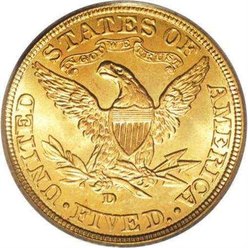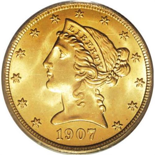 <B>1907-D $5 MS67 PCGS.</B></I> An interesting variety, the mintmark is punched far to the left of center, below centered below the first talon in the eagle's claw left of the feather tip, and leaning sharply to the left as well.<BR> This specimen is an amazing Superb Gem, the only such piece ever certified by PCGS with none finer. Both sides have pristine surfaces with highly lustrous mint frost and rich yellow luster. Coined in the second year of Denver Mint production and representing excellent quality control for such a young facility. Only one collector in the Set Registry program can own such a remarkable coin.<BR><BR><B>Coin Engraver:</B> Christian Gobrecht<BR><BR><b>Shipping:</b> Coins & Currency (<a target="_blank" href="http://www.heritageauctions.com/common/shipping.php">view shipping information</a>)