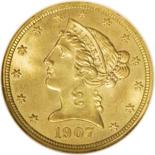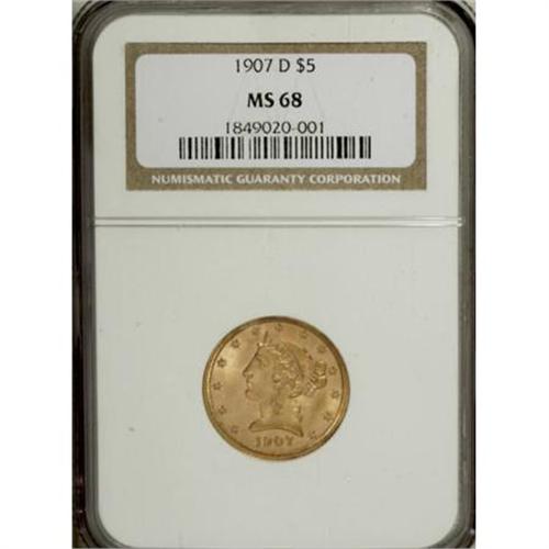 <B>1907-D $5 MS68 NGC.</B></I> An important concept in statistics is that of the outlier, a piece of data that diverges from the norm. In a population, the outliers are freak occurrences, exceptional, improbable, and surprising. All three adjectives apply to this stunning Superb Gem, apricot-gold with a touch of peach in the centers. Both sides display swirling luster, bold detail, and exquisitely preserved surfaces.<BR> Garrett and Guth (2006) mention this particular example in their entry on the issue. They note: "There has been one example certified as MS68 by NGC." The coin offered here is the single finest 1907-D half eagle at either NGC or PCGS, and while NGC has certified three Liberty half eagles in MS69, all three hail from 19th century issues, and this stunning piece is tied for the finest 20th century example of the series graded by that service (7/07).<BR><BR><B>Coin Engraver:</B> Christian Gobrecht<BR><BR><b>Shipping:</b> Coins & Currency (<a target="_blank" href="http://www.heritageauctions.com/common/shipping.php">view shipping information</a>\)