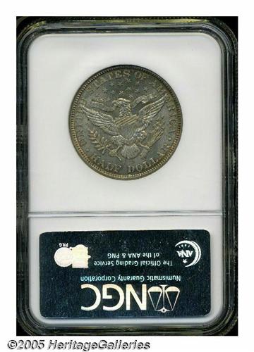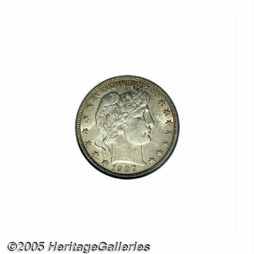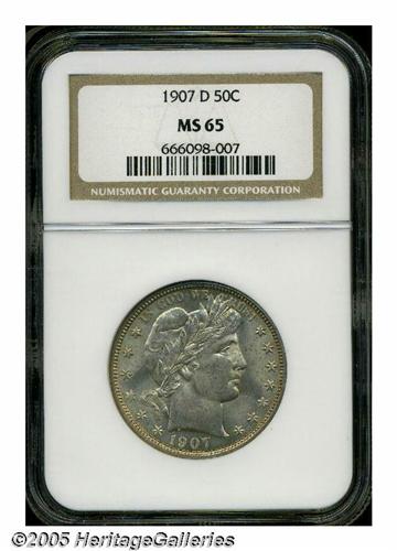 <B>1907-D<50C> MS65 NGC.</B></I> Although the '07-D is a high mintage issue with 3.85 million pieces produced, surprisingly few have survived today at the Gem level. According to the current NGC population figures, only 14 other Gems have been certified by them with five in higher grades (5/05). This is a sharply struck example that has gray-golden toning over each side that deepens somewhat to golden-russet on the reverse. Well defined throughout, there are no singularly mentionable abrasions.