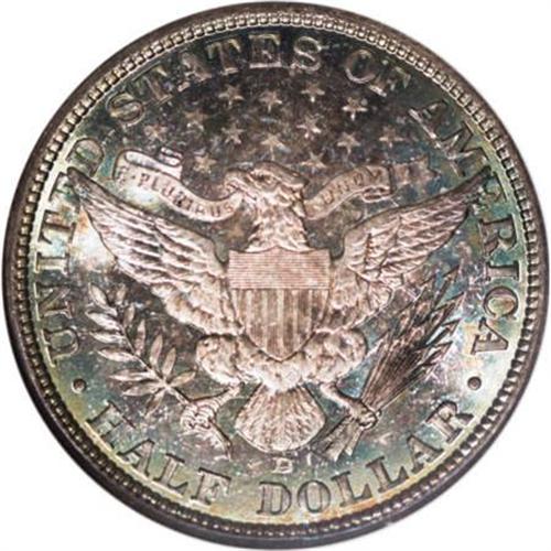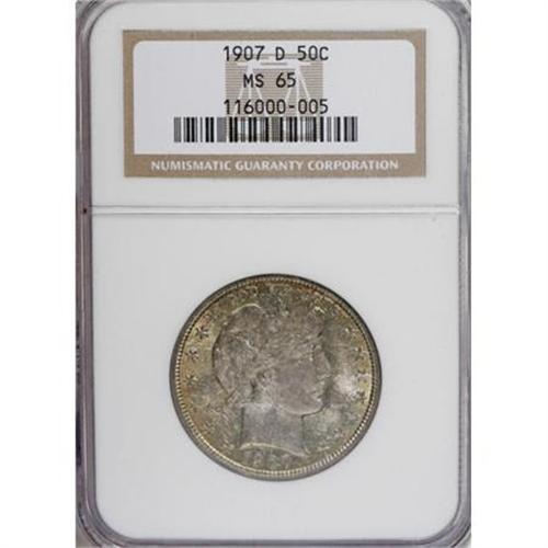 <B>1907-D 50C MS65 NGC.</B></I> Forest-green, powder-blue, and gold shades enrich this lustrous Denver Mint half. Well struck despite inconsequential blending of detail on the fletchings and right shield corner. The portrait has only moderate contact, and the fields are beautifully preserved. Census: 14 in 65, 6 finer (5/07).<BR><I>From The Belle Glade Collection, Part Two.</B></I><BR><BR><B>Coin Engraver:</B> Charles E. Barber<BR><BR><b>Shipping:</b> Coins & Currency (<a target="_blank" href="http://www.heritageauctions.com/common/shipping.php">view shipping information</a>\)