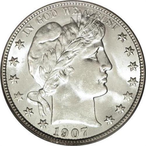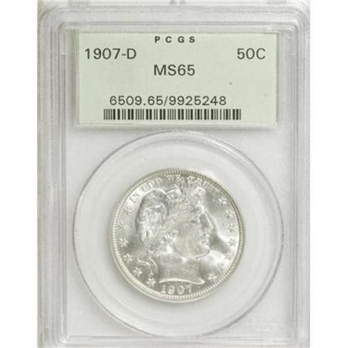 <B>1907-D 50C MS65 PCGS.</B></I> This lovely ice-white Gem shows untoned surfaces with radiant luster and excellent eye appeal. The fledgling branch mint in Denver apparently suffered from the same problems on this half dollar design as did, notably, New Orleans, as the strike is somewhat soft on the right shield corner, the eagle's wing, and the claw. Tiny contact marks on the cheek preclude an even finer grade. Certified in a green-label holder.<BR><I>From The Southwest Collection.</B></I><BR><BR><B>Coin Engraver:</B> Charles E. Barber<BR><BR><b>Shipping:</b> Coins & Currency (<a target="_blank" href="http://www.heritageauctions.com/common/shipping.php">view shipping information</a>)