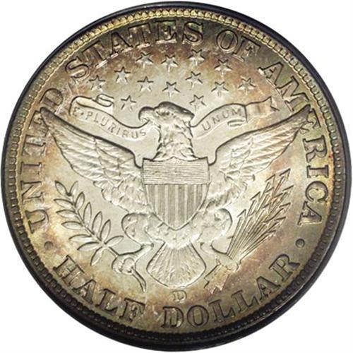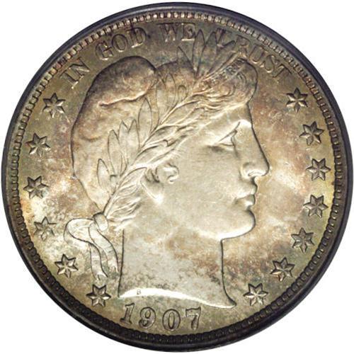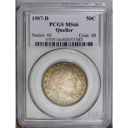 <B>1907-D<50C> MS66 PCGS.</B></I> Ex: Queller Collection. Both the obverse and reverse are cloaked in antique-golden, pink, and sea-green patina while the centers are bright and lustrous. More than 3.85 million pieces were issued in the Denver Mint's second year of production, of which only a couple hundred Mint State pieces have reached the certification services. At this lofty grade level, the population dwindles rapidly. Population: 7 in 66, 3 finer (3/06). <BR><BR><B>Important notice:</B> Heritage usually auctions material at the rate of 200-250 lots per hour. On some occasions eBay Live bid software or the Internet may not be able to keep up with the pace of the auction. We recommend placing a realistic absentee bid now as insurance to avoid disappointment. Occasionally the auctioneer may eliminate or reject an eBay Live bid, and the auctioneer may also reopen a lot after the close of the eBay live bidding (usually because we missed an audience bid), and may reject your bid even if it shows you as the winning bidder. By bidding via eBay Live, you agree that Heritage may award the lot to another bidder at its sole discretion under the circumstances described above or any other reasonable circumstances. Since eBay bids are not shown to us until we open the lot on the floor, we treat those bids just like floor bids. In most cases the floor responds before the eBay bid is presented to us, due to Internet lag time, so for consistency we have made it a policy that floor bids are always considered first over tie eBay live bids. Also please note that all Heritage lots purchased through eBay Live carry a 20% Buyer's Premium. Please make sure you read the Terms and Conditions before you bid. This lot is being auctioned in conjunction with a live floor auction by Heritage Galleries & Auctioneers. All final auction and invoice information will be supplied by Heritage Galleries & Auctioneers, and all other information should be considered preliminary. Lot:2066 <BR><BR><B>Winning Notification and Billing:</B> After the FINAL session in this auction is complete, Heritage will send e-mail and snail mail invoices. This process normally takes several days. All final auction and invoice information will be supplied by Heritage Galleries & Auctioneers, and all other information should be considered preliminary. <BR><BR>This auction will be conducted on a live auction floor and over the Internet through eBay Live. If you choose to place an absentee bid, please take a moment to <font color='#0000ff'><u><a href='http://pages.ebay.com/liveauctions/help/before/laabsentee.html'>learn how eBay Live absentee bidding works</a></u></font><font color='#000000'>