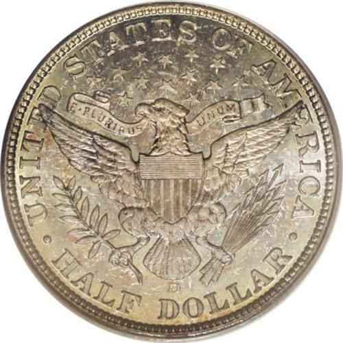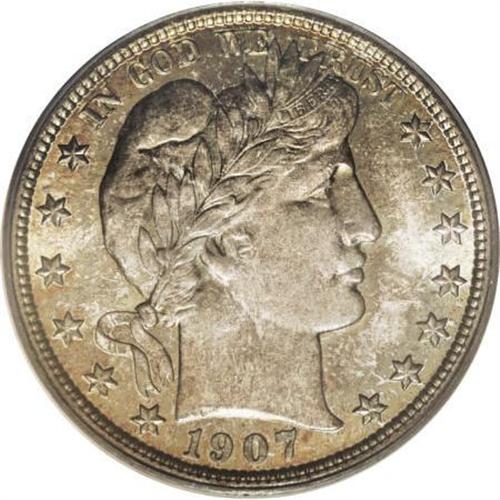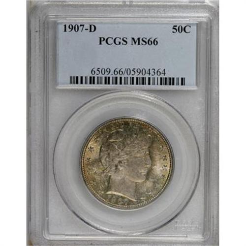 <B>1907-D 50C MS66 PCGS.</B></I> This Denver Mint issue is not easy to locate in such a high state of preservation. In fact, each of the major grading services has certified a mere 14 coins apiece at MS66, and few finer, from an original mintage of 3,856,000 half dollars. This well struck Premium Gem displays a layer of variegated green, gold, and russet patina over both sides. The highly lustrous surfaces are nearly immaculate. Population: 9 in 66, 3 finer (8/07). <BR><BR><BR><B>Coin Engraver:</B> Charles E. Barber<BR><BR><b>Shipping:</b> Coins & Currency (<a target="_blank" href="http://www.heritageauctions.com/common/shipping.php">view shipping information</a>)
