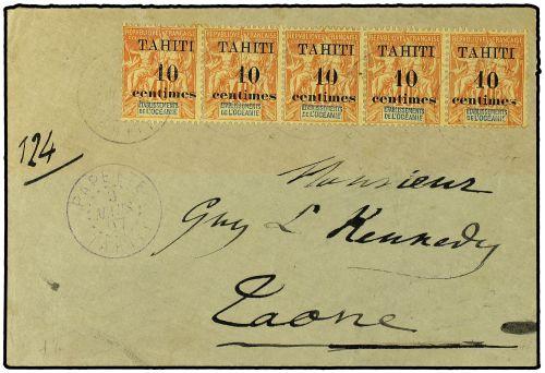 1907 Envelope to Laone franked strip of five 40c. L´Oceanie "Sage" surcharged "Tahiti 10 Centimes",