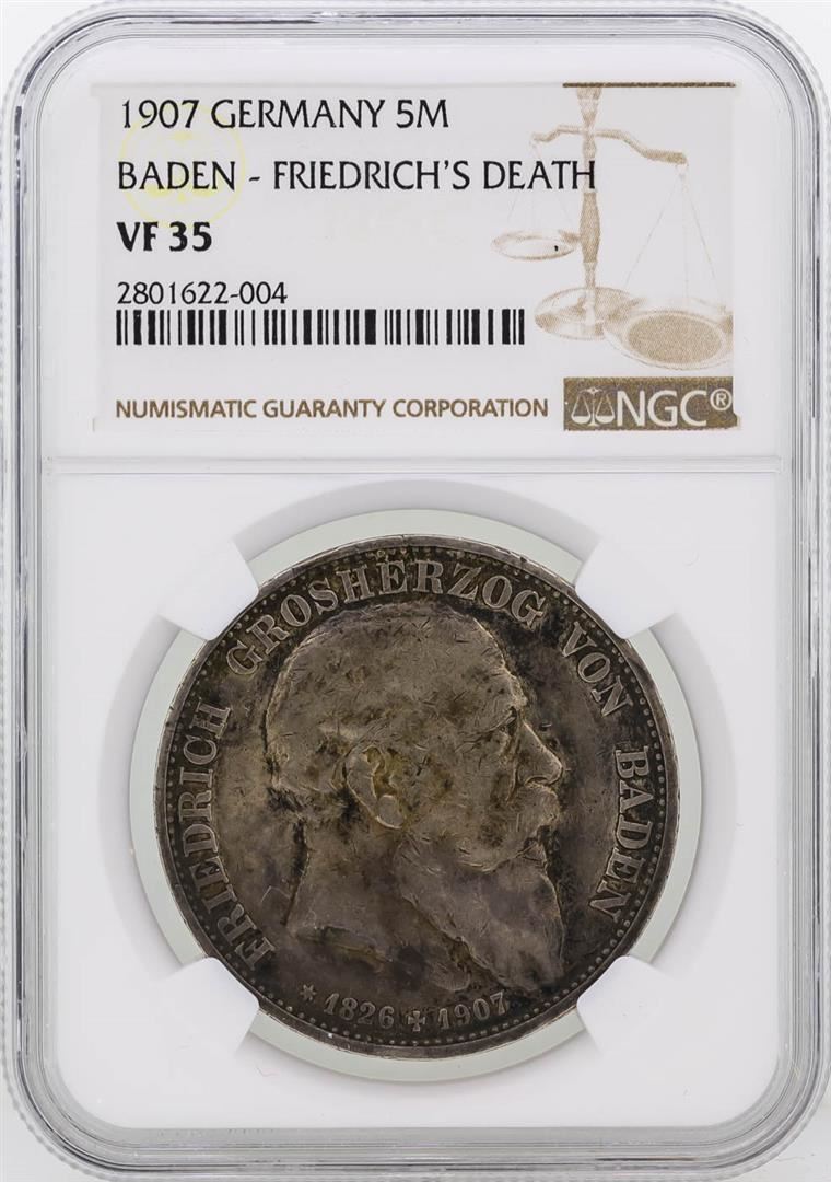 One 1907 Germany 5M Baden Friedrich's Death Coin NGC Graded VF35. NGC Certified.