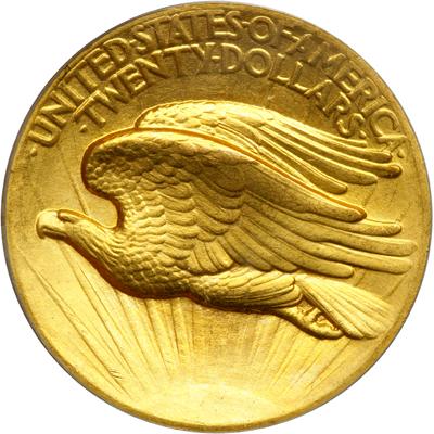 1907. High Relief, Roman Numerals, Flat Rim. PCGS graded MS-65. A gorgeous gem example exhibiting delicate golden-orange luster on both sides. The flat rim variety is rarer than the wire edge, although many would-be bidders simply wish to own a representative sample of America's most beautiful gold coin. And an outstanding Gem example it is! This has a flat rim around the wide flat border (no wire edge evident). Mintage of the High Relief coins totaled 11,250 struck in November and December, 1907. Wire-edge examples, which are more plentiful than those with flat rim, have an approximate three to one ratio. It is understood 4,000 were struck with flat (not wire) rim. This was publicized in 1908, soon after delivery of the High Reliefs to the Treasury, and for a long time thereafter many listings included these as separate varieties. Warm golden surfaces exhibit the ever-desirable strong satin luster and fine swirling texture, which is the kind of quality that really engages the aesthetic sense with its beauty. The date, for the first time on an American coin, is in Roman numerals, MCMVII (The designer of the 1915 Panama-Pacific Exposition $50 pieces imitated this device when dating his models.) Pop 92; 45 finer (PCGS # 9136).