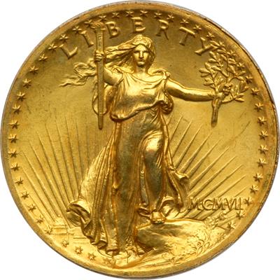 1907. High Relief, Roman Numerals, Wire Rim. PCGS graded MS-64. Nice bold strike. Nice golden toning. The more easily obtainable Wire Rim variety of this immensely popular 20th century gold classic, and an eye-appealing, choice MS64 representative as well. There is a slight reddish tinge over satiny, well preserved surfaces and contact is limited to a few minor marks that are all but imperceptible. If the would-be buyer is considering the rather large outlay necessary to make a purchase of a nicer High Relief Saint, this one comes highly recommended (PCGS # 9135).