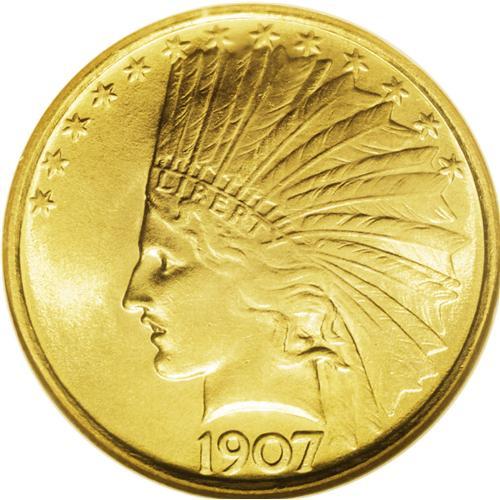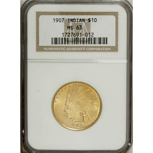 <B>1907 $10 No Periods MS63 NGC.</B></I> Examples of this issue are always in demand, with type collectors a large factor. While other pieces may have higher technical grades, the overall eye appeal of this Select Uncirculated eagle is difficult to upstage. Slight striking weakness at the center of the obverse is counterbalanced by the vibrant luster and minimally marked surfaces.<BR><I>From The Dr. Eugene Cherny Collection of $5 and $10 Indians.</B></I><BR><BR><b>Shipping:</b> Coin/Currency (<a target="_blank" href="http://www.heritageauctions.com/common/shipping.php">view shipping information</a>)