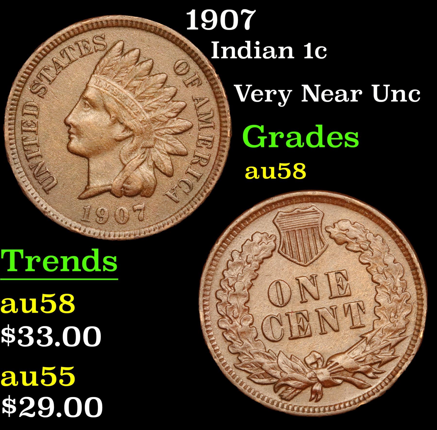 1907 Indian Cent 1c Grades Choice AU/BU Slider. Very Near Unc