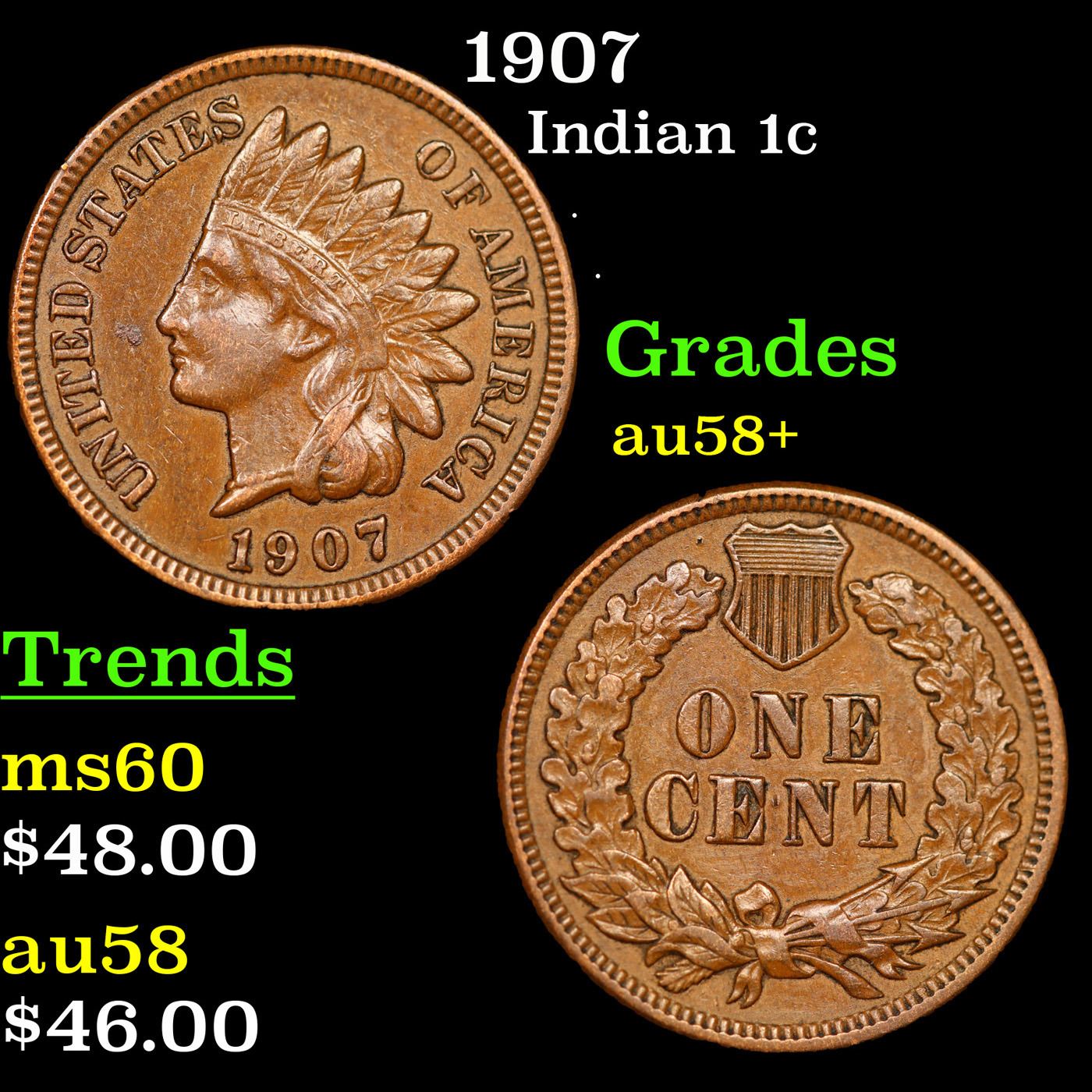 1907 Indian Cent 1c Grades Choice AU/BU Slider+.