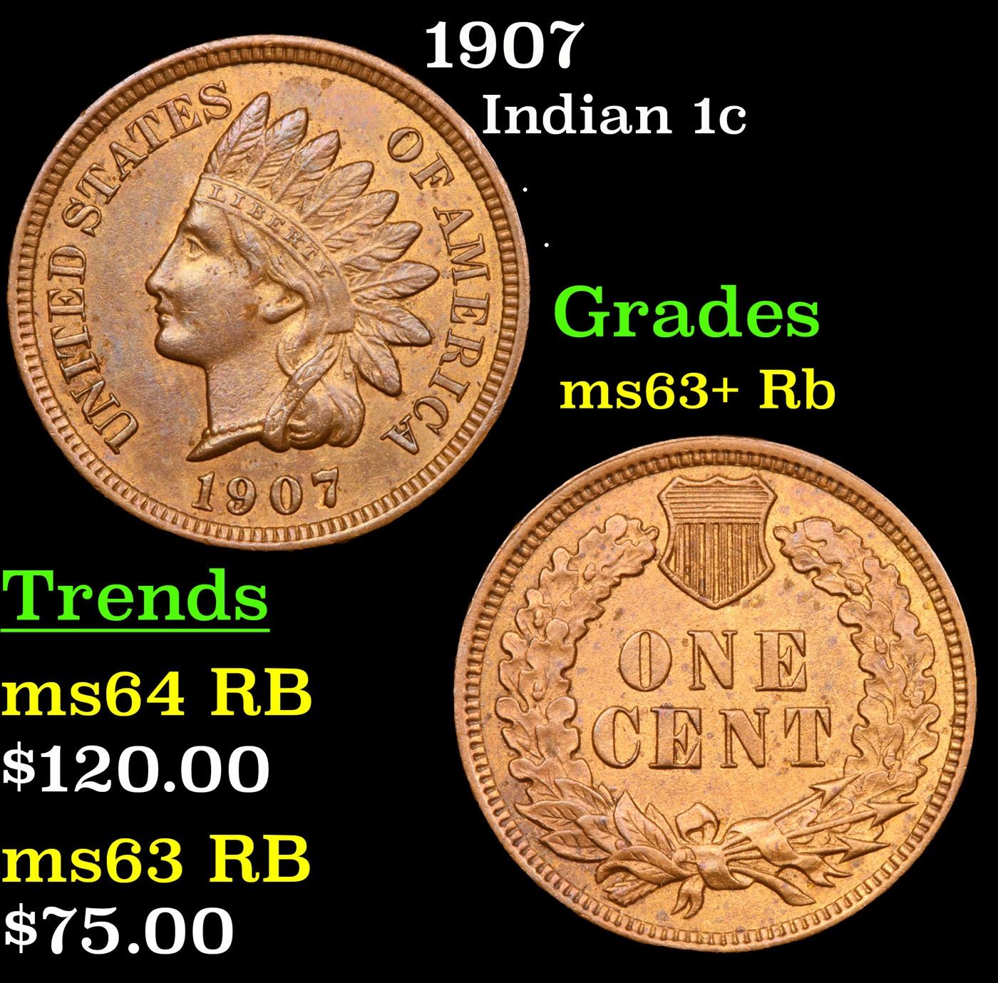 1907 Indian Cent 1c Grades Select+ Unc RB.