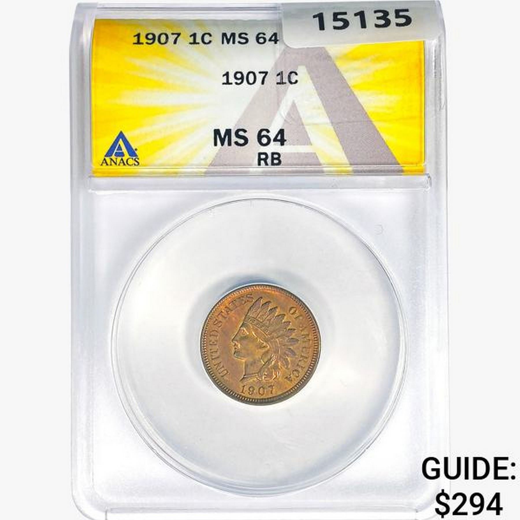 1907 Indian Head Cent ANACS MS64 RB
