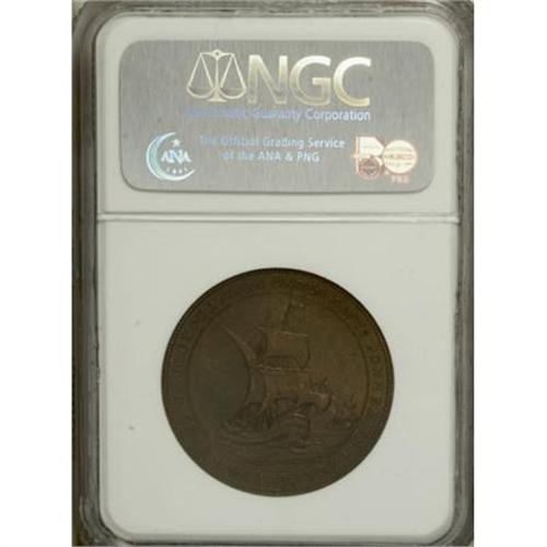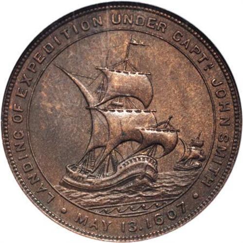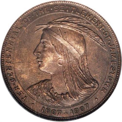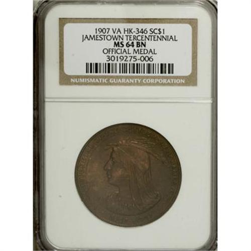 <B>1907 Jamestown Tercentennial, HK-346, MS64 Brown NGC.</B></I> Bronze, 34.9 mm, "scarce" (HK, 1963). A pleasing milk-chocolate example of this popular so-called dollar. Jamestown, Virginia, celebrated its quadricentennial in 2007, accompanied by a visit from Prince Philip and Queen Elizabeth II. Census: 7 in 64 Brown, 3 finer (12/07).<BR><BR><b>Shipping:</b> Coins & Currency (<a target="_blank" href="http://www.heritageauctions.com/common/shipping.php">view shipping information</a>)