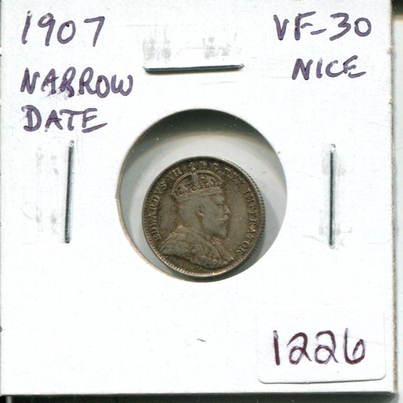 1907 Narrow Date Canadian Silver 5 Cents. VF-30. Nice.