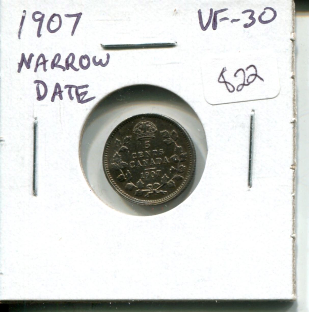 1907 Narrow Date Canadian Silver 5 Cents. VF-30.