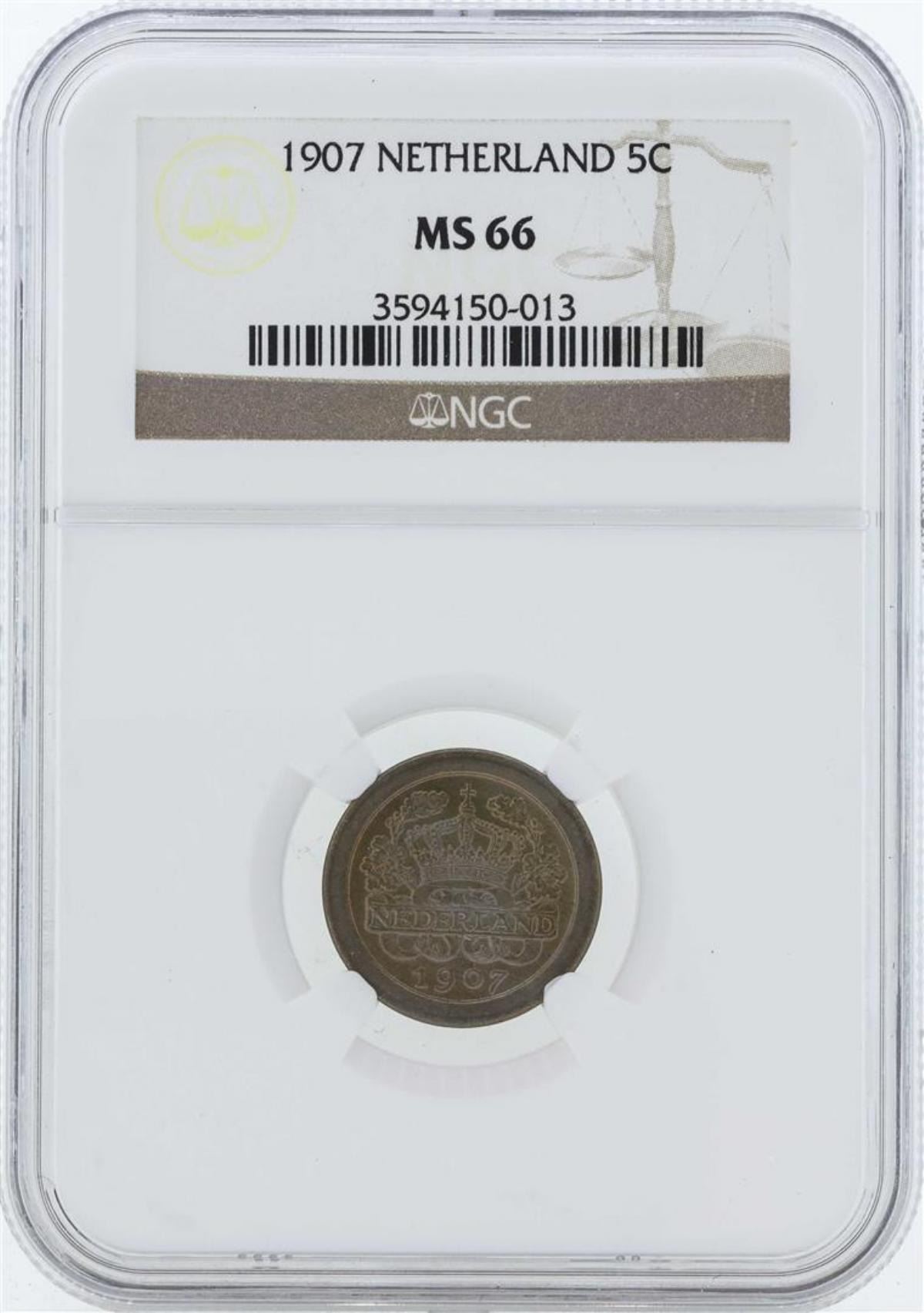 One 1907 Netherland 5 Cents Coin NGC MS66. NGC Certified.
