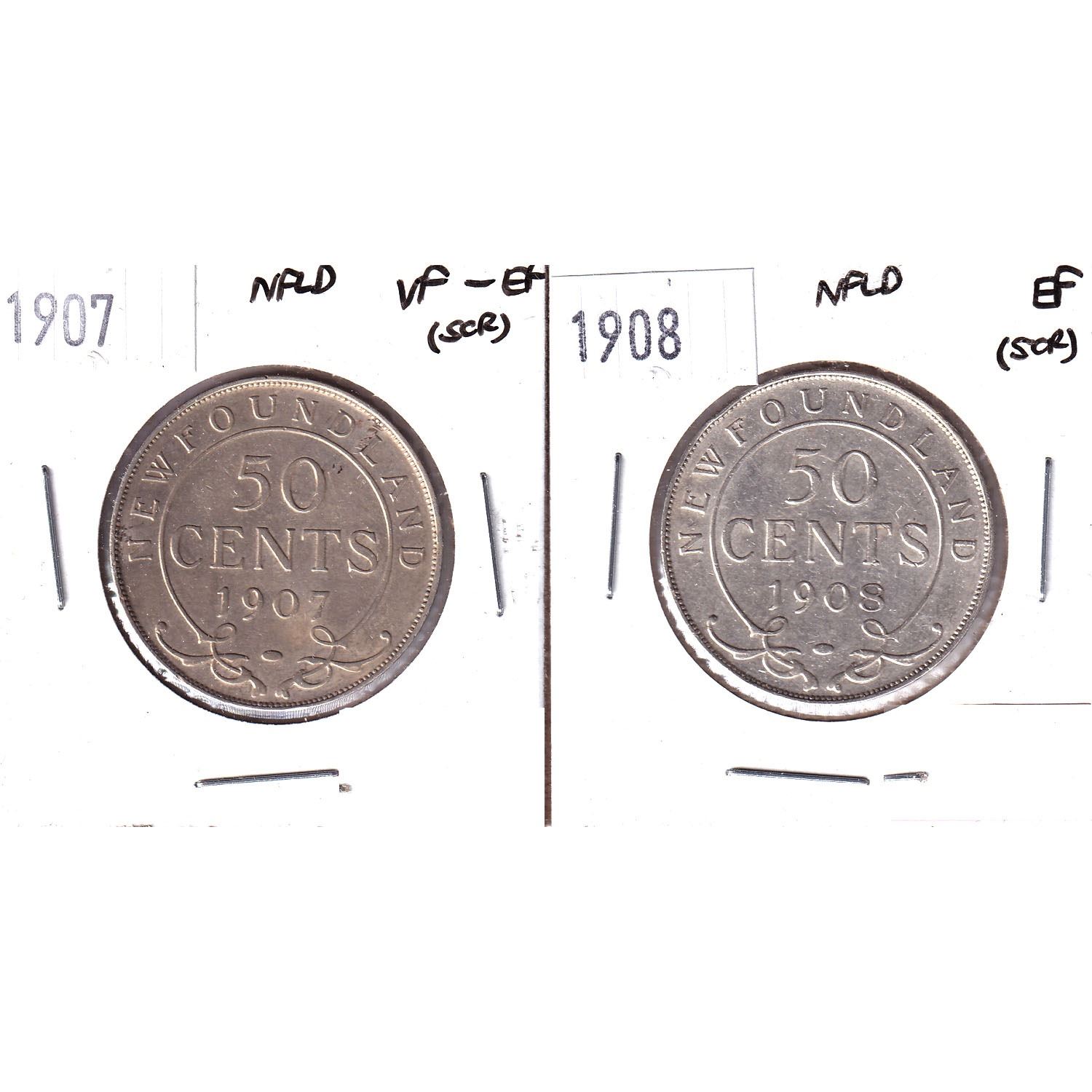 1907 Newfoundland 50-cent VF-EF & 1908 Newfoundland 50-cent Extra Fine (coins are scratched). 2pcs