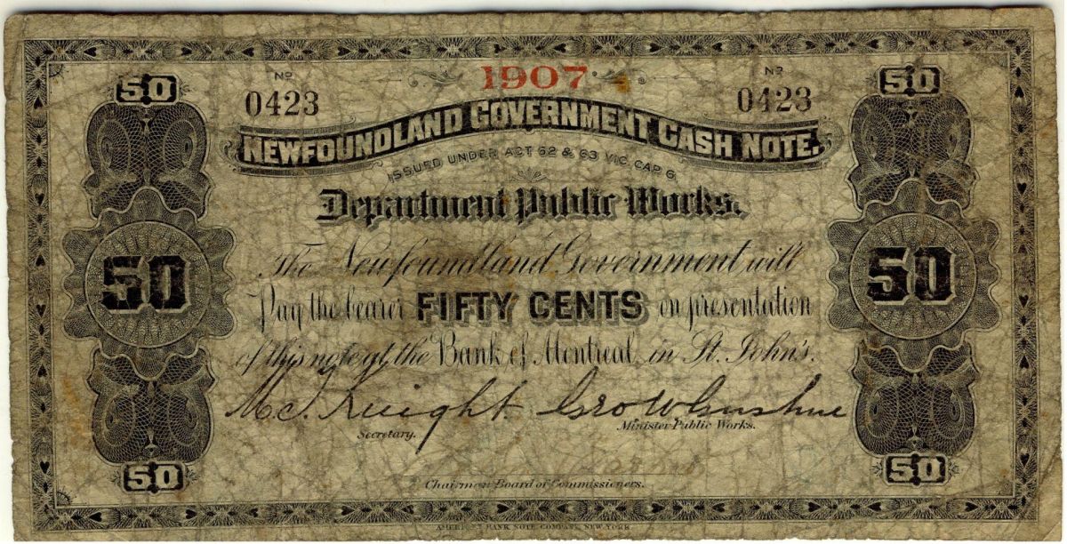 1907 Nfld 50¢ NF-3g #0423. RARE issue. Only 2000 examples were issued and according to the CPMS very few issues are known to exist. VG